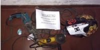 respectivo disco de corte, un taladro marca Makita de color verde, un casco