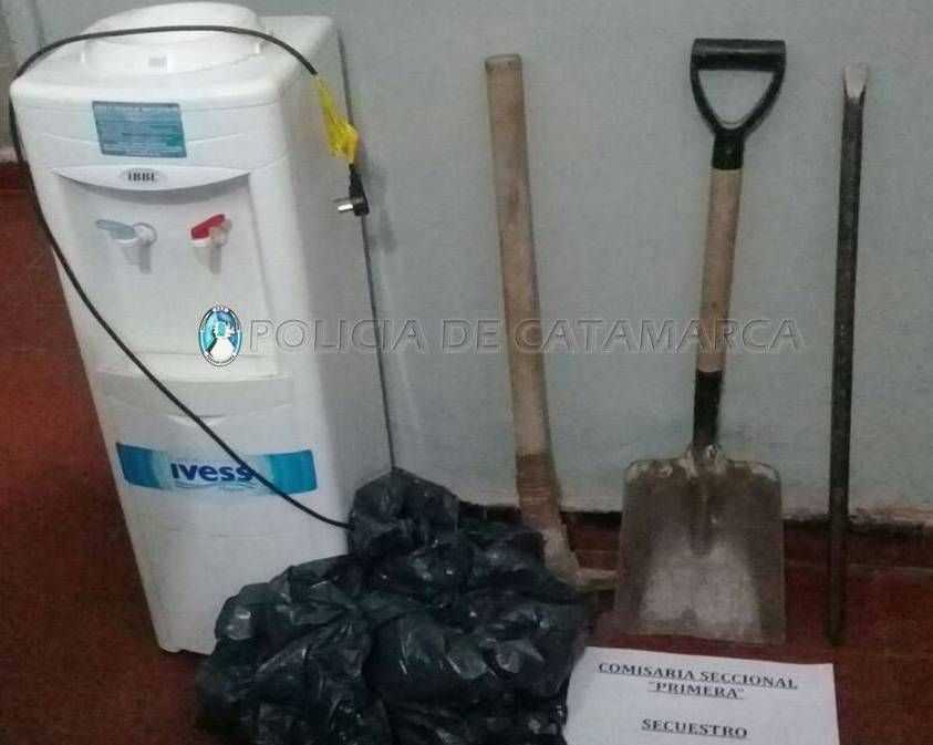 trasportaban un dispenser, una pala ancha, una picota, y una barreta de hierro,