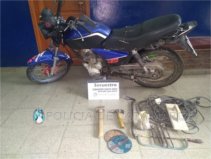 En el lugar, los policías encontraron una maza, 2 rollos de tanza, 1 prolongador de corriente, 1 martillo, 1 fratacho, 2 tenazas, 1 sierra de mano, 1 disco de corte para madera, 1 disco de corte para mampostería, 3 discos de corte para metal, 4 llaves de toma corriente, ½ Kilogramo de clavos, 2 cajas octogonales de luz, 1 barreta, 1 tacho de 20 litros de pintura, que serian productos del ilícito, como así también una motocicleta marca Motomel CG 150 cc., dominio 217- JZG, de color azul, en la que circulaban estas personas.