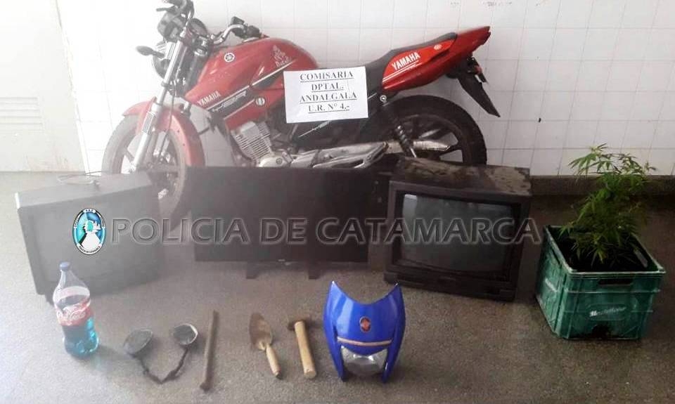 Continuando con la tarea investigativa, y bajo las directivas de la Fiscalía de la Segunda Circunscripción Judicial, a cargo del Dr. Manuel Alejandro Scidá, los policías materializaron un registro domiciliario en una vivienda de la Peatonal N° 5 del barrio 12 de Julio, donde lograron recuperar una óptica de motocicleta Gilera y una botella de 2, ½ litros de combustible, como así también secuestraron un par de espejos de motocicleta, y tres televisores; un LCD 32" marca Philips, un Hitachi 21", y un Philco 21", para determinar su legitima propiedad y procedencia.