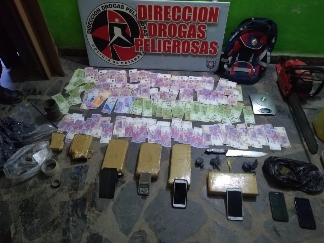 En un domicilio propiedad de la familia Pacheco, que funciona como taller de motocicletas, los efectivos secuestraron 7 Kg. de Marihuana en panes compactados, una (01) motocicleta Honda CG 150 cc., de color azul, un (01) automóvil Renault Clío, de color gris, una (01) bicicleta Venzo rodado 26, de color blanco, elementos para el fraccionamiento de la sustancia, una (01) motosierra, un (01) cuchillo tipo carnicero con restos de Marihuana, dos (02) balanzas de precisión, cinco (05) teléfonos celulares de varias marcas y modelos, y la suma de cuarenta mil pesos ( $ 40.000) en efectivo, discriminados en billetes de distinta denominación.