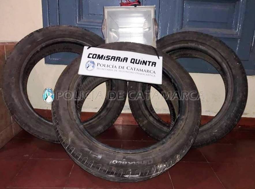 En el lugar, observó a un sujeto llevando tres cubiertas de automóvil marca Pirelli, rodado Nº 16, y un reflector.