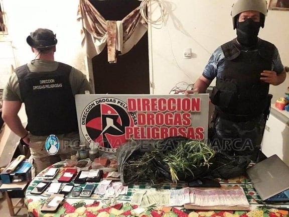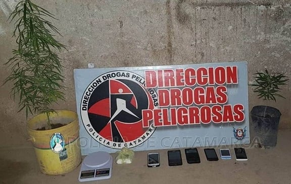 Tras irrumpir en la casa Nº 33 y Nº 65, propiedad de las familias de apellidos Peñaloza y Figueroa respectivamente, bajo las directivas del Juzgado Federal, a cargo del Dr. Miguel Ángel Contreras, Secretaría a cargo del Dr. Luis Alberto Baracat, el personal policial interviniente secuestró 2 1/2 Kg. de Marihuana, distribuidos en trozos compactados, cogollos, dosis listas para comercializar, picadura de la sustancia formada por tallos y hojas, 23 plantas y 300 semillas de la variedad Cannabis Sativa, 12 teléfonos celulares de distintas marcas y modelos, 2 balanzas digitales y una para pesar gramos, y alrededor de $15.000 en efectivo, discriminados en billetes de distinta denominación.