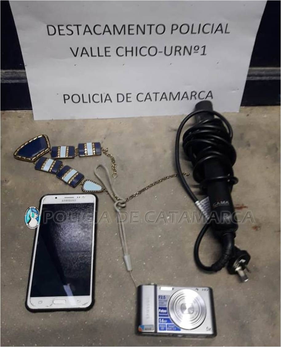 Estos dos jóvenes, al momento de realizarles la requisa correspondiente, los policías les encontraron entre sus prendas de vestir una cámara Digital Samsung de color gris, un teléfono celular Samsung J-7 blanco, con funda de color negro, una planchita para el cabello marca GAMA y un collar de fantasía, de color azul.