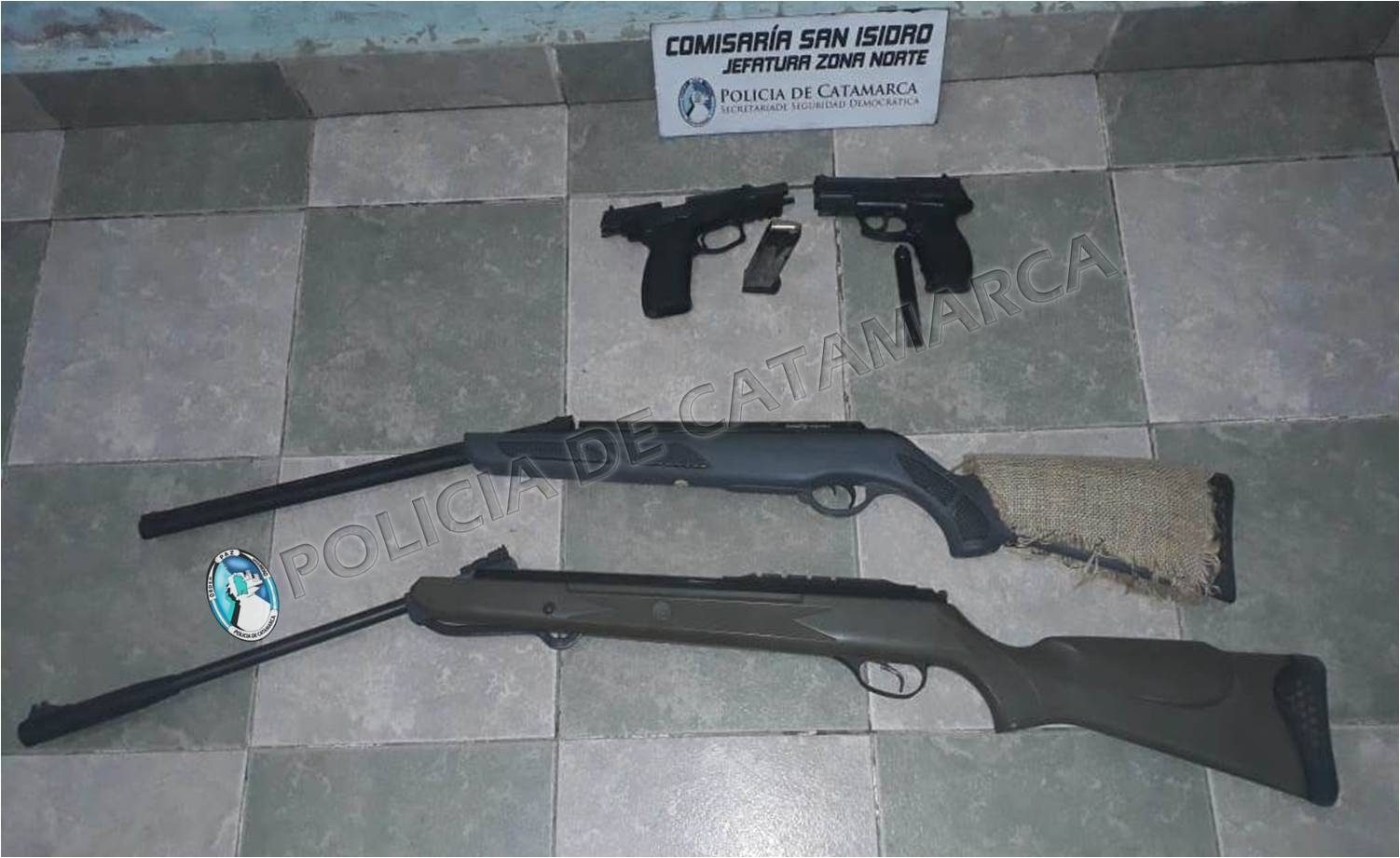 El personal policial interviniente procedió al secuestro de una pistola marca Bersa calibre 9 mm; una pistola a gas Crosman C 11, calibre 4,5 mm., un rifle aire comprimido marca Hutsan 125, y un rifle aire comprimido Gamo.