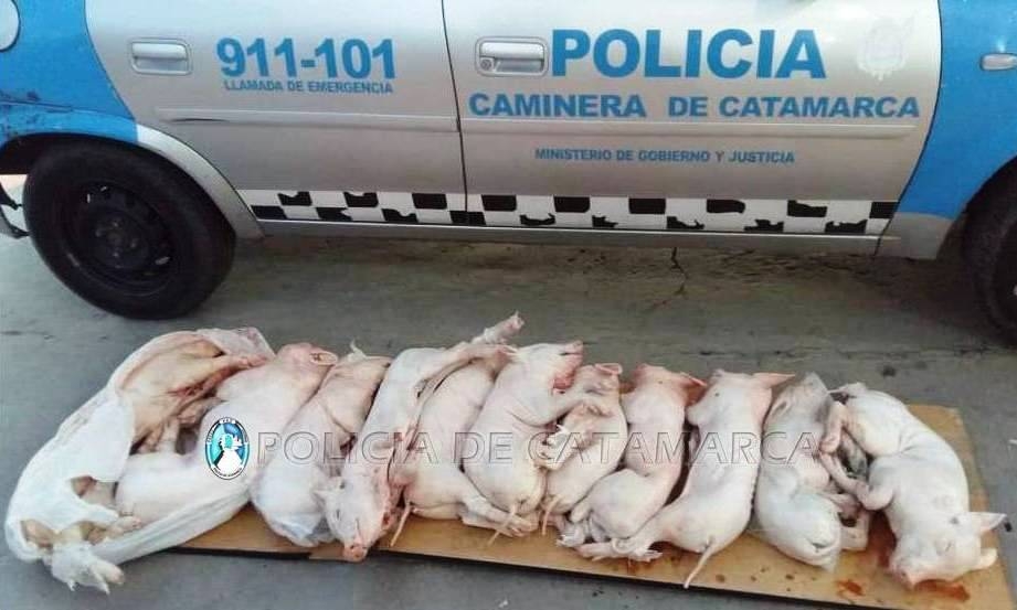 Al inspeccionar el rodado, los efectivos observaron que en el baúl del vehículo transportaba 11 animales porcinos faenados, sin la cadena de frío y medidas de salubridad correspondientes, por lo que se dio intervención al personal de Bromatología de la Municipalidad de Valle Viejo, quien decomisó la carne y labró las actuaciones de rigor.