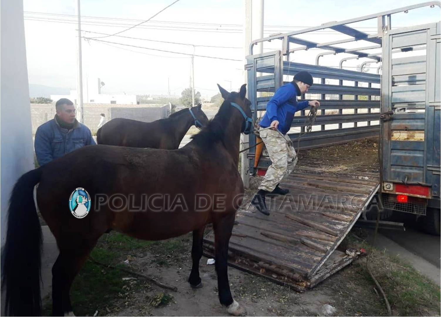 En el lugar, secuestró dos animales equinos: una yegua, pelaje colorado listado, crina corta y un potrillo, alazán cara blanca, con miembro anterior izquierdo calzado a la corona y miembro posterior derecho calzado a la caña, crina corta.