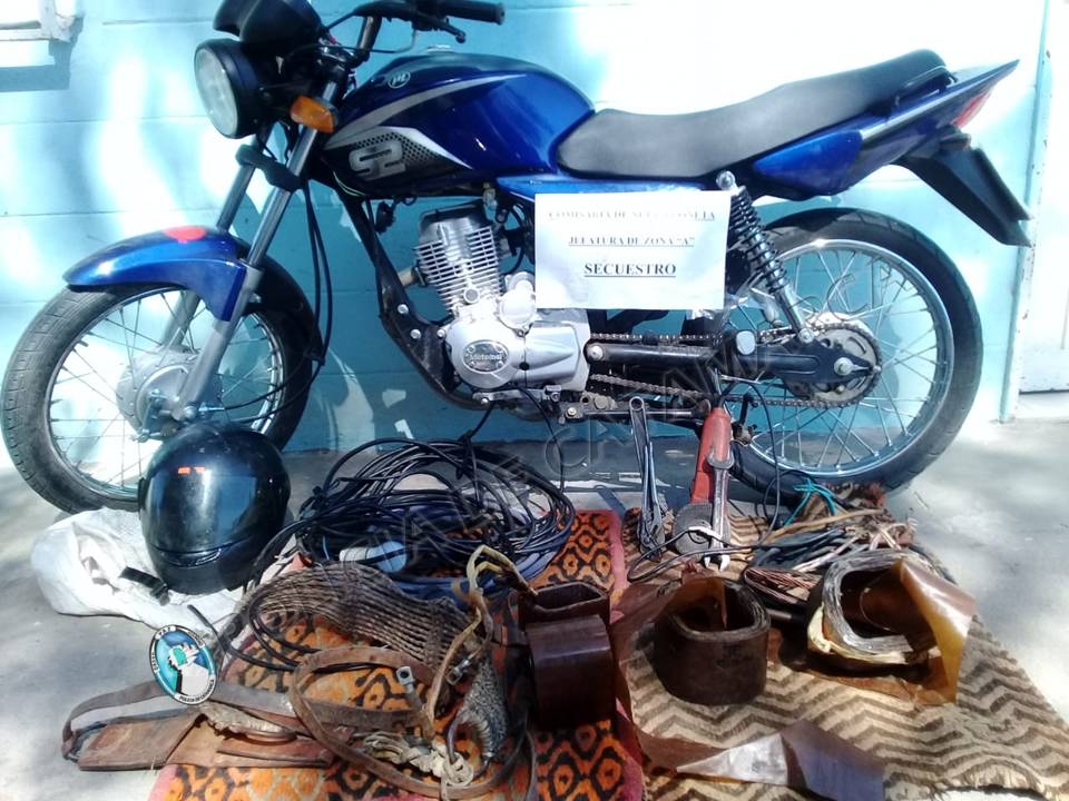 En el lugar, procedieron a la aprehensión de dos jóvenes de 18 y 21 años, de apellidos Bazán y Del Prado, quienes circulaban a bordo de una motocicleta Motomel CG 150 cc., de color azul, llevando dos peleros, una cincha, dos estribos, una amoladora de color anaranjado con disco de corte, una llave pico de loro, un rollo de cable de color gris, dos rollos de cable negro, cuatro bobinas de cobre, una llave de dos bocas, y un casco protector para moto, de los cuales no pudieron justificar su legitima propiedad y procedencia, por lo que quedaron en calidad de secuestro.