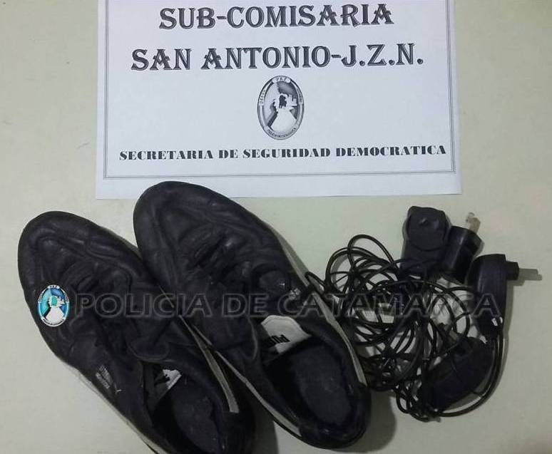 Al llegar al lugar, los policías procedieron al secuestro de un par de botines de fútbol de marca Puma, y varios cargadores para teléfonos celulares que estaban ocultos entre la maleza de un descampado existente en la zona y que, conforme averiguaciones practicadas, serían producto de un ilícito perpetrado en la calle Hermanas Villagrán, propiedad de un hombre mayor de edad.