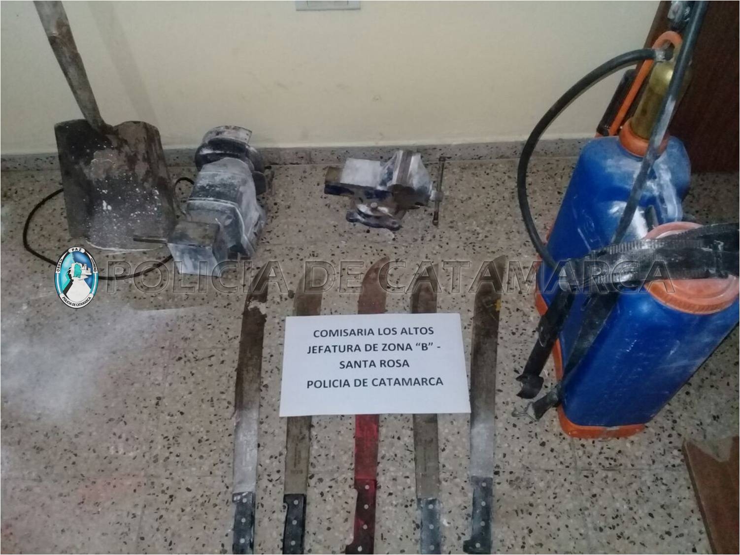 Allí recuperaron una mochila de fumigar, cinco machetes, una pala y un banco con una piedra esmeril, una morsa de banco y se procedió a la aprehensión de un joven de apellido Leiva de 26 años, quien habría sido sindicado como el supuesto autor de sustraer los elementos quedaron en calidad de secuestro.