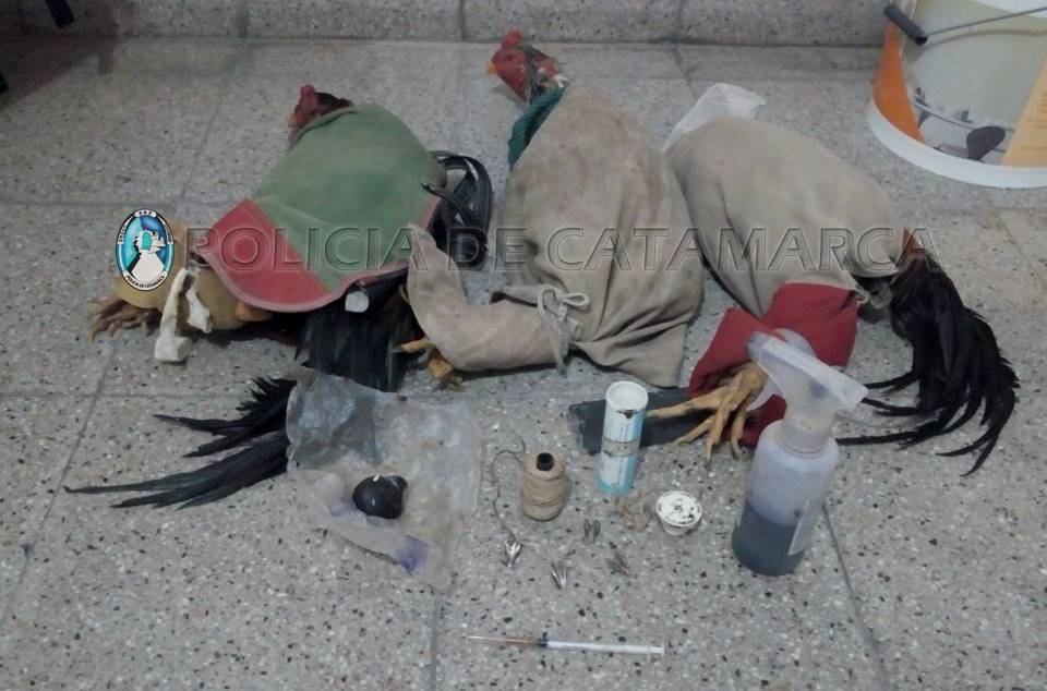 Al inspeccionar el rodado, los Policías observaron que transportaban tres gallos de riña, cuatro púas metálicas, una Jeringa, una bobina de hilo de algodón, un frasco con un líquido y otros elementos, que quedaron en calidad de secuestro luego de labrar las actuaciones correspondientes.