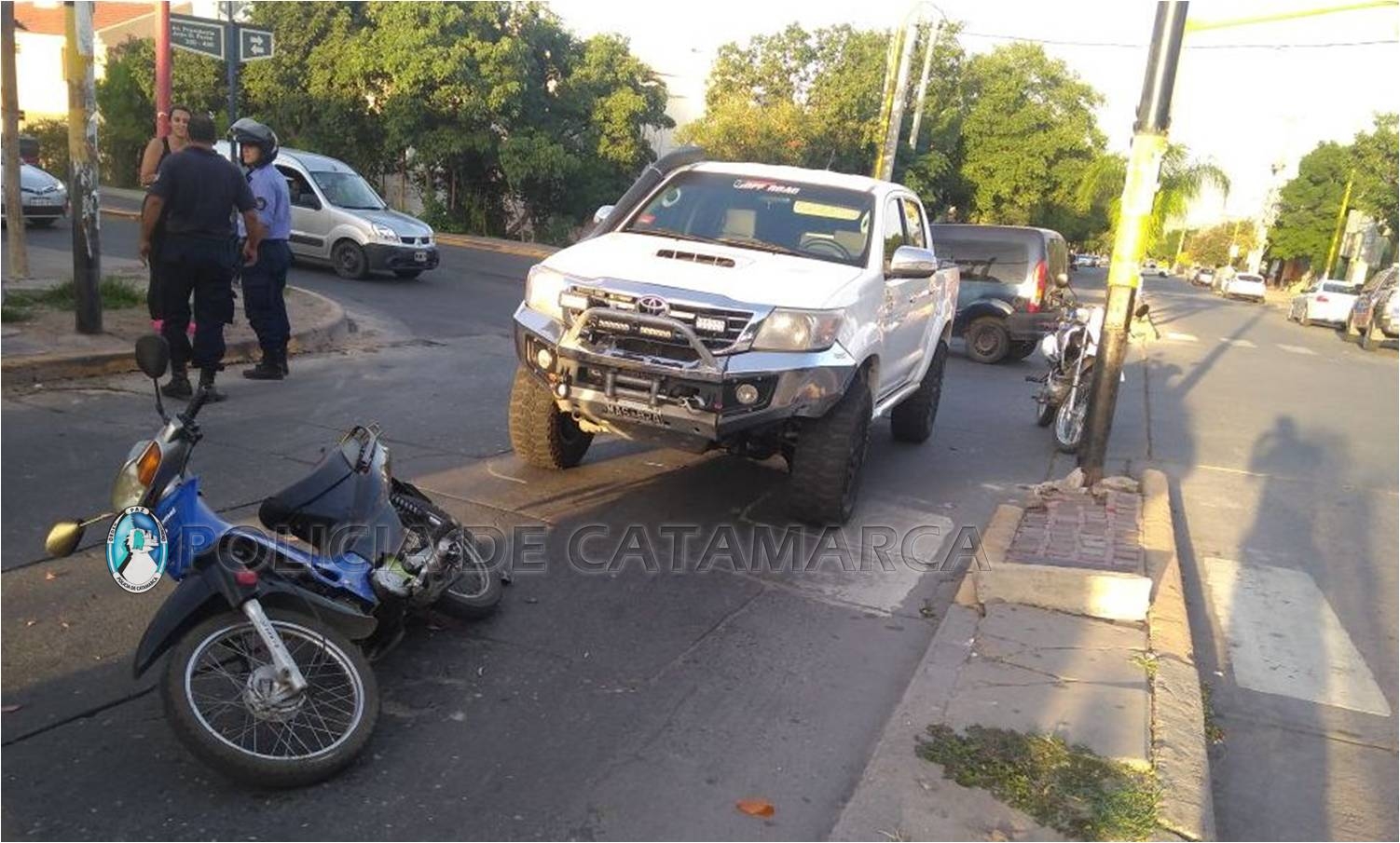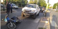 Un adolescente de 15 años circulaba en una camioneta Toyota Hilux blanca, dominio MAS-824, y por razones que se tratan de establecer, colisionó con una motocicleta Motomel DLX 110 cc., dominio 675-HWQ, de color azul, al mando de Luis Rodolfo Molas (60).