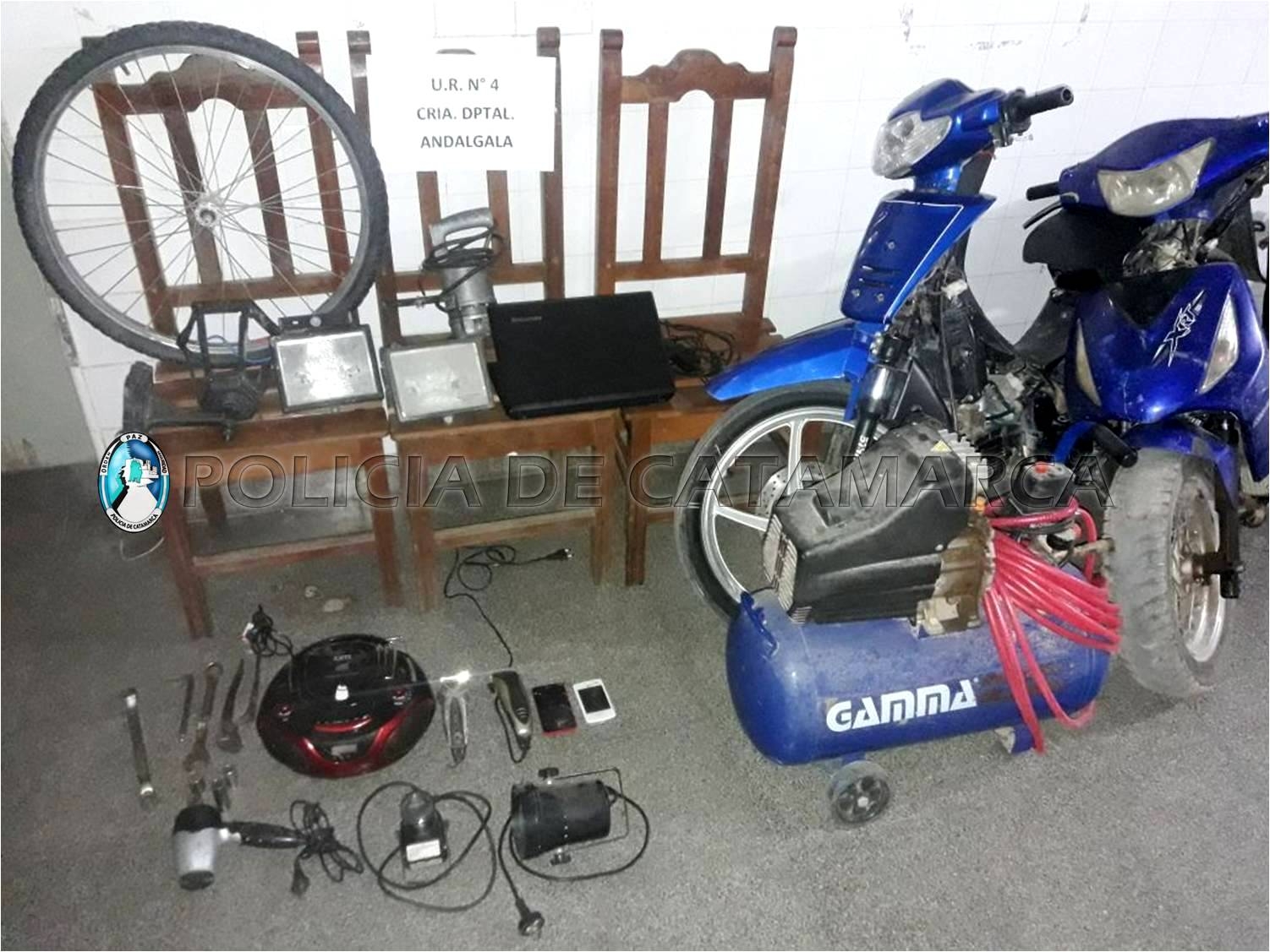 Tras irrumpir en viviendas propiedad de una familia de apellido Ruiz, el personal policial interviniente secuestró elementos vinculados a las causas investigadas y otros de dudosa procedencia, tales como tres sillas de maderas de color marrón, dos reflectores, dos luces Led, varias herramientas de mano, una rueda armada de bicicleta rodado 29, un compresor Gamma azul, una tarraja, un taladro percutor, un secador de cabello, dos teléfonos celulares marcas LG de color blanco y Nokia de colores negro y rojo, una computadora Lenovo negra, dos motocicletas; una Motomel 110 cc., de color azul y una Maverick azul 110 cc.