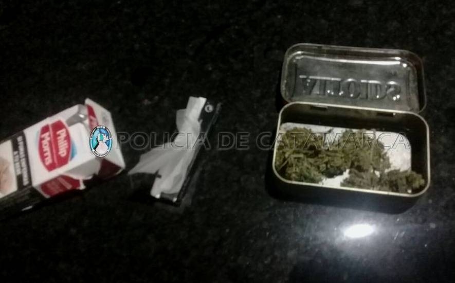 Al inspeccionar el rodado y, al realizar la requisa correspondiente, el personal interviniente encontró entre sus pertenencias un recipiente metálico conteniendo 5 gr. de marihuana, un triturador y papel para armar cigarrillos.