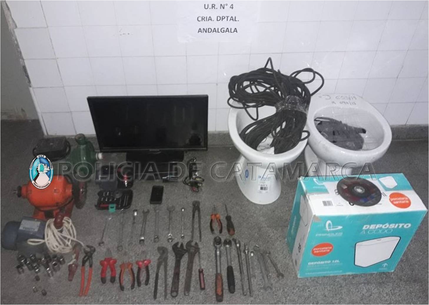 Los damnificados manifestaron haber sido víctimas de delitos contra la propiedad, efectivos de la Comisaría Departamental Andalgalá realizaron una ardua tarea investigativa, y llegaron hasta la calle Salta de la Villa 21, distrito Huachaschi, donde procedieron al secuestro de un bidet, de color blanco, y aprehendieron a un joven de apellido Carrizo, de 21 años.