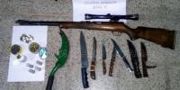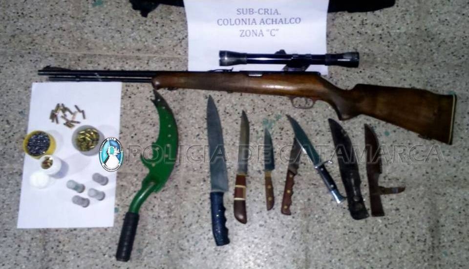 Al llegar al lugar, y realizar recorridos en la zona, el personal interviniente observó que el rodado estaba estacionado en inmediaciones a un descampado, y encontró a un hombre oculto entre la maleza del lugar, quien tenía entre sus manos un rifle marca Sauro calibre 22, con mira telescópica, con 15 cartuchos del mismo calibre, una caja con 125 cartuchos más, 250 balines para aire comprimido y cuatro cartuchos Antitumulto (AT).