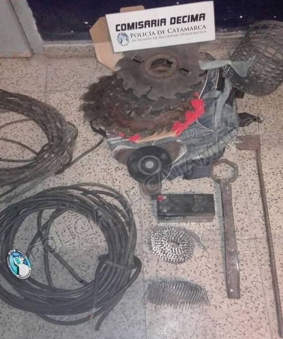 Los policías observaron que estas personas llevaban siete discos de corte, cables de alta tensión, una batería en gel, una grinfa, dos tiras de clavos para pistola neumática, que habrían sido sustraídos de un aserradero del lugar.