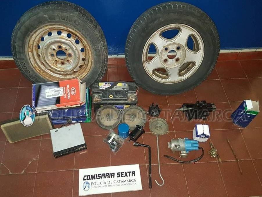 Entre lo entregado, figuran 2 ruedas de auxilio, 1 llave para rueda, 1 batería Noura, 1 estéreo marca Inkel, 1 gato hidráulico de color negro, 3 parlantes negros, 3 filtros de aire, 2 filtros de aceite, y 1 distribuidor de un auto.