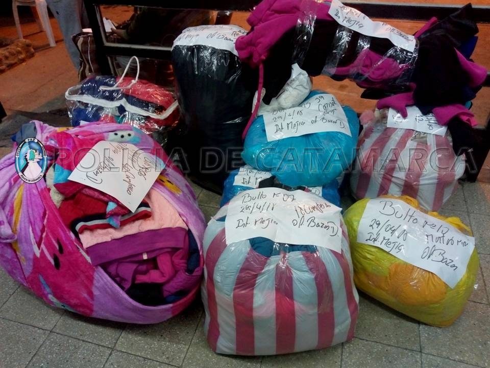 Tras inspeccionar el rodado, los efectivos procedieron al secuestro de 12 bultos que contenían: 63 pantalones, 39 remeras mangas largas, 4 docenas de camisetas, una docena de botas, 13 frazadas, una docena de pantuflas, 83 camperas, un acolchado con dos fundas; todo de origen extranjero, valuados en unos 20 mil pesos.