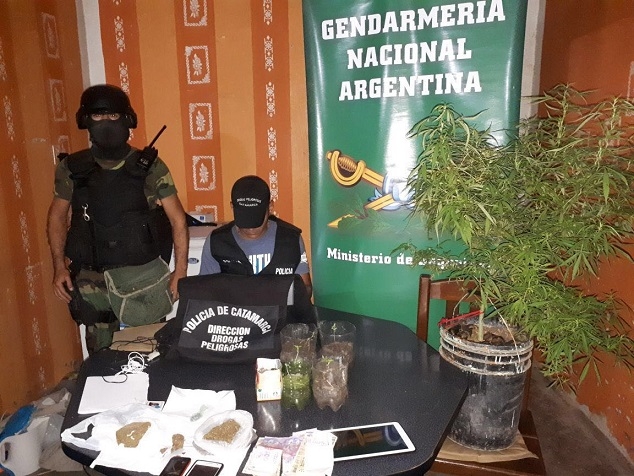 Tras irrumpir simultáneamente en tres viviendas del Barrio Las Parcelas S/N y en otra del Barrio Los Maestros de Los Altos, el personal interviniente secuestró una planta de marihuana de aproximadamente 1 metro de altura, que estaba siendo cultivada; 6 plantines de la variedad Cannabis Sativa; 5 teléfonos celulares de distintas marcas y modelos; 1 motocicleta Honda Wave 110 cc; medio kilo de Marihuana distribuídos en trozos compactados y picadura, y $2.000 en efectivo, discriminados en billetes de distinta denominación.