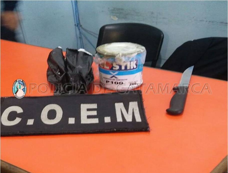Esre último sujeto, mientras era identificado intentó lesionar a los efectivos con un cuchillo tipo tramontina, que quedó en calidad de secuestro, al igual que una bolsa de plástico que contenía una lata de pegamento.