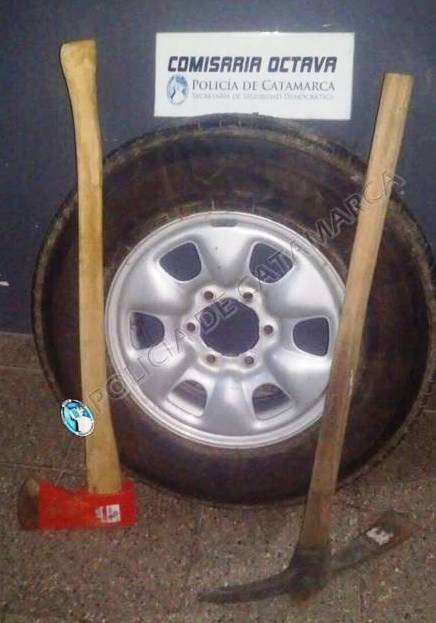 Los sujetos habrían sido sorprendidos en la vía pública ofreciendo a la venta un hacha, una picota y una rueda de auxilio, rodado Nº 16, que quedaron en calidad de secuestro para determinar su legitima propiedad y procedencia.