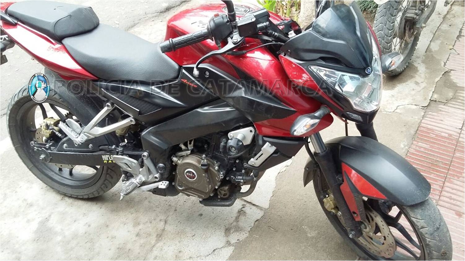 A la altura del ingreso a la localidad de San Antonio, Fray Mamerto Esquiú, observó que dos sujetos circulaban a bordo de una motocicleta Bajaj Rouser 200 cc., de color rojo, en actitud sospechosa.
