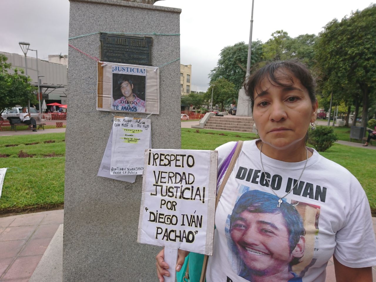 “Hasta que esto no se resuelva por la verdad, vamos a seguir, lo único que pedimos es que se vaya a juicio con la imputación que se merecen los policías que es tortura seguida de muerte”, manifestó la mujer con carteles pidiendo justicia por su hijo.