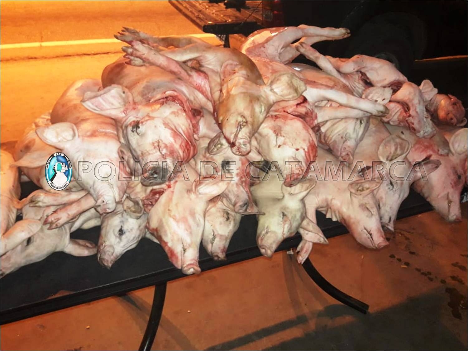 Asimismo, a las 2.30, los policías hicieron lo propio con una camioneta Toyota Hilux negra, conducida por un hombre mayor de edad, de apellido Delgado, que transportaba en el interior de un freezer 25 animales porcinos faenados, sin la correspondiente cadena de frío y medidas de salubridad correspondientes.