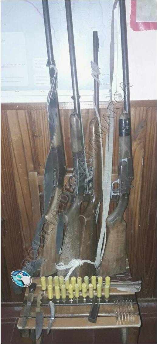 El vehículo era conducida por un hombre de 31 años, de apellido Gómez, en compañía de cinco personas del sexo masculino de apellidos Valverde (39), Abregú (43), y tres jóvenes de apellido Cabrera de 18, 23 y 26 años respectivamente, y secuestraron una Carabina Mahely calibre 22 mm., y tres escopetas marcas Amadeo Rossi, Centauro e Invicta, todas calibre 16 mm., 24 proyectiles calibre 22 mm., 20 cartuchos calibre 16 mm., dos cuchillas tipo carnicero, y una cortapluma, al igual que el rodado en el que circulaban, en virtud que estas personas carecían de la documentación correspondiente.
