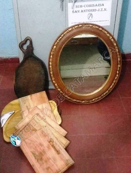 En ese barrio de la localidad de Piedra Blanca, Fray Mamerto Esquiú, el personal policial observó que en un descampado estaban ocultos entre la maleza, diez tablas de madera y un espejo ovalado.