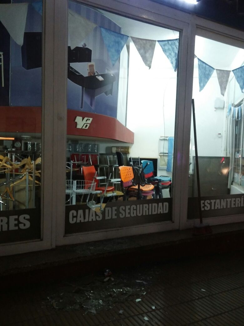 Como lo muestra la imagen, alcanzaron a romper vidrios del local de venta de insumos de oficina ubicada en calle Sarmiento. Intentaron hacer lo en un mismo en un local de viajes y turismo pero no pudieron.