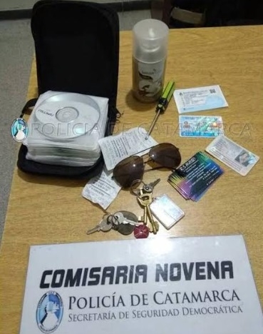 Al realizarle la requisa correspondiente los policías encontraron entre sus prendas de vestir un destornillador Philips, de colores negro y amarillo, un par de anteojos de sol, dos llaves doble paleta, un candado con su respectiva llave, un estuche con 28 CD, un aromatizador de ambiente, dos llaves de candado, una tarjeta SUBE, licencia de conducir, cédula, DNI y documentación varia perteneciente a otra persona, que quedaron en calidad de secuestro, hasta determinar su legitima propiedad y procedencia.