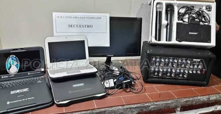 Según se informó, en el lugar secuestraron 5 netbook Positivo BGH, pertenecientes al programa Conectar Igualdad; 1 monitor Samsung 19 pulgadas; 1 amplificador de sonido y 2 micrófonos con sus respectivos accesorios.