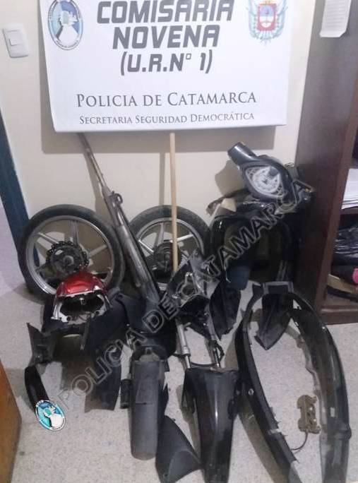 En un descampado existente en inmediaciones al velódromo de la avenida Los Minerales, procedieron al secuestro de una rueda armada de moto rodado Nº 17, con llanta de aleación de ilumino y cubierta marca Yuanxing, una rueda armada rodado Nº 14 con llanta de aleación de aluminio y cubierta marca Atlantig, otra cubierta con su eje y una corona de transmisión, un caño de escape, un guardabarros delantero, un faro trasero, dos amortiguadores con pastillas de freno a disco, y varias motopartes que estaban abandonas en el lugar.