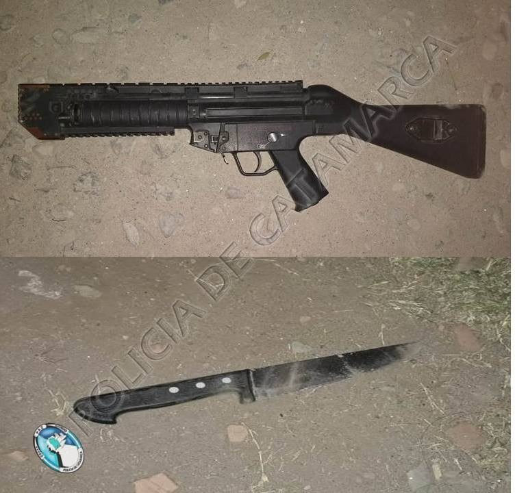 De inmediato, el personal interviniente realizó rastrillajes por la zona y en inmediaciones a un patio interno del inmueble procedió al secuestro de un arma de fuego tipo carabina con culata de plástico, de color negro, sin cargador, y una cuchilla tipo carnicero.