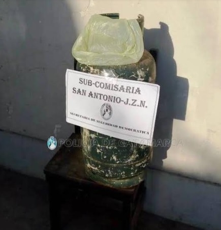Hoy, a las 8:55, en un descampado ubicado frente al barrio 40 viviendas Bella Vista de la localidad de San Antonio, Fray Mamerto Esquiú, la policía secuestró una garrafa de gas de 15 kg. que estaba oculta entre la maleza.