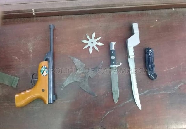 Tras realizarles la requisa correspondiente, los uniformados encontraron entre sus pertenencias una pistola de aire comprimido, una navaja, un puñal, dos estrellas ninjas y una bayoneta de acero, de las cuales no pudieron acreditar su legitima propiedad y procedencia, por lo que quedaron calidad de secuestro.