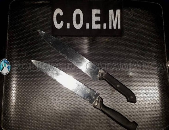 Al observar la presencia policial, el ahora aprehendido arrojó al interior de un domicilio dos cuchillas tipo carnicero, que quedaron en calidad de secuestro.