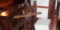 Se trata de una mesa de algarrobo ovalada con dos patas torneadas; 4 sillas de algarrobo; 1 chifonier de algarrobo; 1 mueble para televisor de algarrobo; 1 alacena de cedro; 1 juego de mesa con 4 banquetas plegables de camping; 1 una cama de una plaza de madera; 2 colchones de una plaza; 1 televisor; 1 Tv Led marca PHILCO de 32"; 2 ollas rojas; 2 ollas de aluminio; 1 bifera marca ESSEN; 1 sartén; 2 reposeras; 1 especiero de algarrobo con rollos de cocina; 1 fuentón; 1 plancha marca LILIANA; juegos de sabanas; varios pares de calzado; utensilios de cocina y prendas de vestir varias.