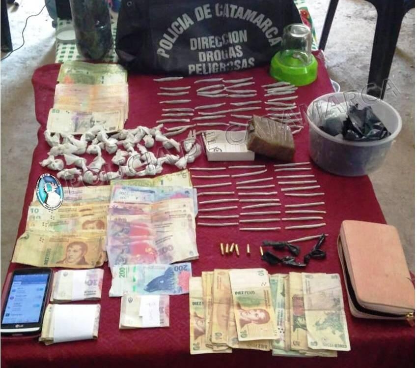 Tras irrumpir en una vivienda ubicada en la calle Malpaso S/N del Barrio Matadero, en la Ciudad de Andalgalá, propiedad de la familia Vergara, el personal policial interviniente secuestró gran cantidad de recortes de nylon, la suma de $30.000, discriminados en billetes de distinta denominación; 1 teléfono celular LG; 6 cartuchos calibre 22 largo punta hueca; una importante cantidad de Cocaína y Marihuana distribuída en dosis y cigarrillos de armado casero, listos para comercializar, y una licuadora con restos de la sustancia estupefaciente.
