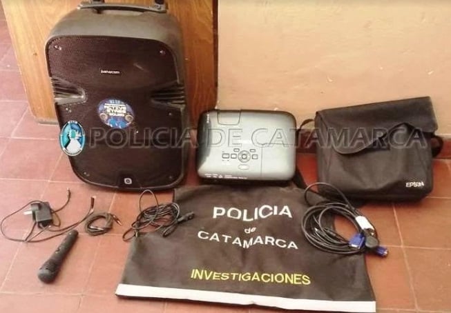 Las medidas judiciales fueron ordenadas por la Fiscalía de Instrucción Nº 3, a cargo del Dr. Ricardo Javier Herrera, y se llevaron a cabo durante la mañana de hoy, en una vivienda de la Manzana A, lote Nº 23 del barrio Los Amigos, propiedad de una familia de apellido Heredia, donde recuperaron un parlante portátil potenciado Panacom S10sm, con su respectivo micrófono, línea y cargador; en tanto que en el Lote Nº 24 del barrio mencionado, donde vive la familia Aybar, incautaron un proyector de imagen EPSON, con sus respectivos cables de alimentación y proyección y estuche, que fueron puestos a disposición de la Justicia interviniente, quedando los moradores supeditados a la prosecución de la causa.