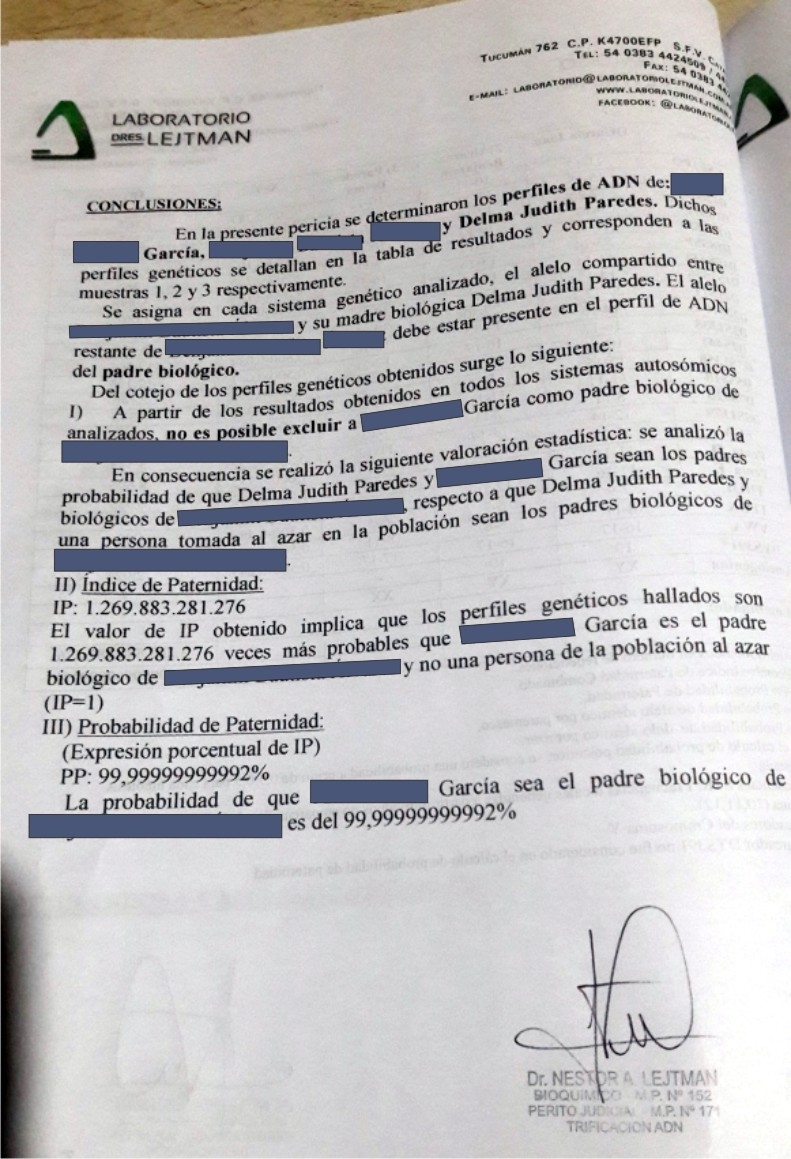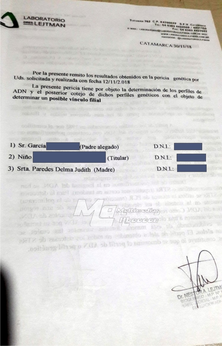 Ahora toma un giro total debido a que la madre del menor Delma Judith Paredes y su abogado presentaron formalmente el análisis de ADN firmado por el Dr. Néstor A. Lejtman, (Bioquímico, Perito Judicial, Trificación ADN), donde comprueban con un 99,9% de exactitud que el niño no es hijo de la persona de apellido Álvarez que se manifiesta mediáticamente solicitando su tenencia, sino que es hijo biológico del Sr. de apellido García, quien reclama ante la Justicia el derecho de paternidad que posee, para lo cual hizo las presentaciones formales y ahora espera la determinación judicial para establecer el vínculo legal con el niño, con quien ya tiene una excelente relación sentimental, de acuerdo a lo que detalló Delma Paredes.