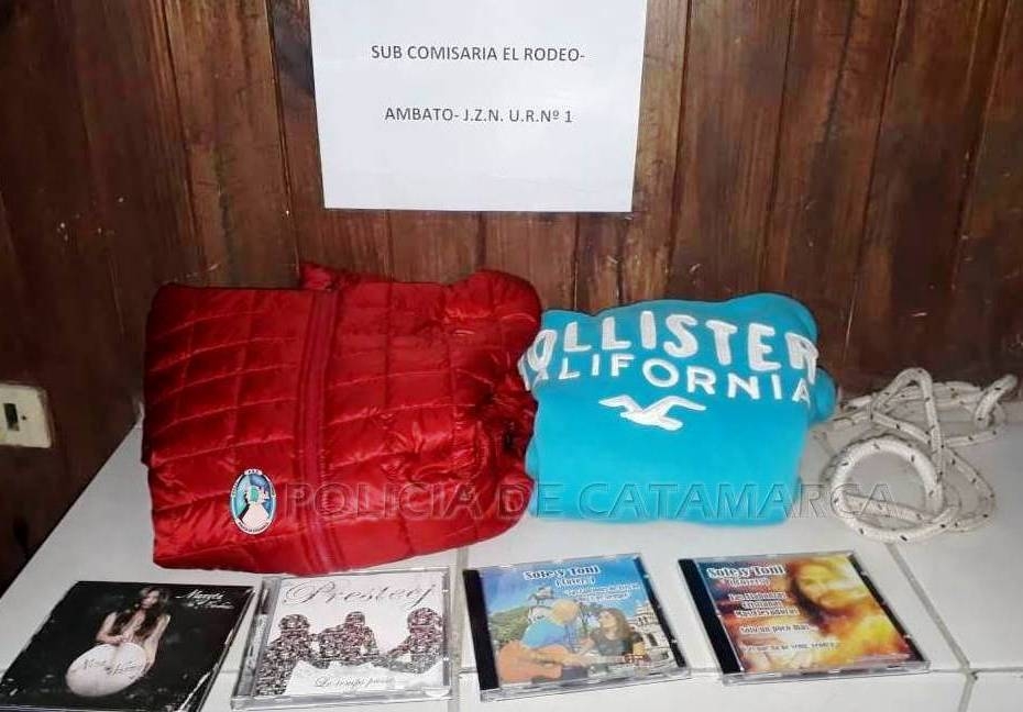 Se trata de una campera de color rojo, cuatro CD, una cuerda de 2 metros aproximadamente y un buzo de color celeste.