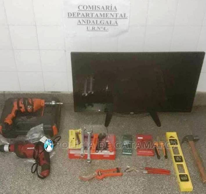 En viviendas, propiedad de las familias Nieva, Gómez, y Luna respectivamente, todas ubicadas en la zona céntrica de la Ciudad de Andalgalá, los policías procedieron al secuestro de un TV marca AOC, de color negro, un taladro Eimell rojo, un Taladro Black & Decker, un martillo y varias herramientas, y aprehendieron a un joven de apellido González, de 20 años, quien sería el presunto autor del hecho investigado.