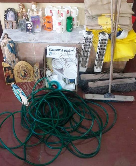 En el lugar, procedieron a la aprehensión de un hombre de apellido Vera, de 33 años, quien minutos antes habría sustraído varios elementos de la Capilla San Isidro Labrador ubicada en avenida Ocampo, para luego intentar trasladar los mismos en un automóvil de alquiler.