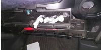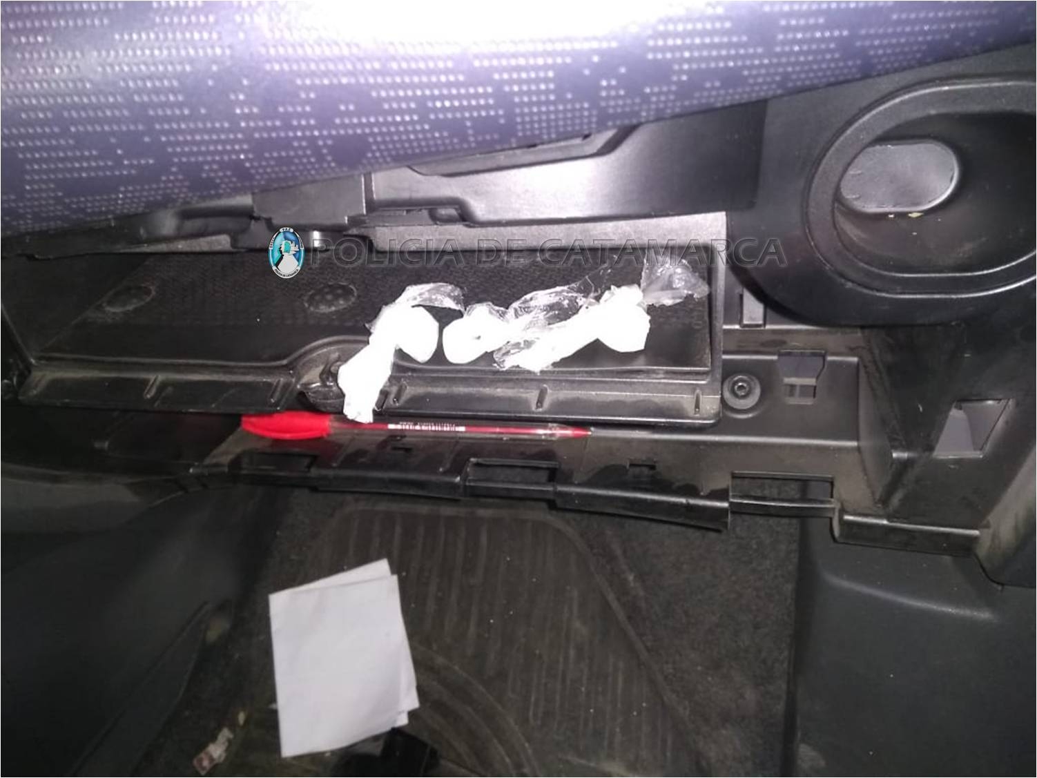 Con la ayuda de un perro adiestrado para detectar estupefacientes, los policías encontraron oculto en el interior de la guantera del vehículo, tres envoltorios de nylon conteniendo una sustancia tipo polvo.