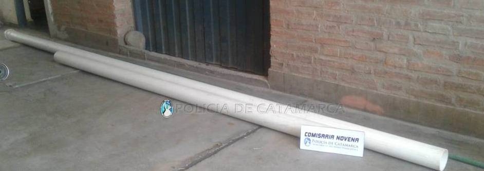 Los policías procedieron a la aprehensión de dos jóvenes de apellidos Toledo y Varela, ambos de 23 años, y al secuestro de dos caños de color blanco, y de otros dos de color verde para termofusión, que habrían sido sustraídos de una obra en construcción ubicada en el barrio Antinaco, propiedad de un hombre de 36 años, como así también incautaron el rodado en el que circulaban.