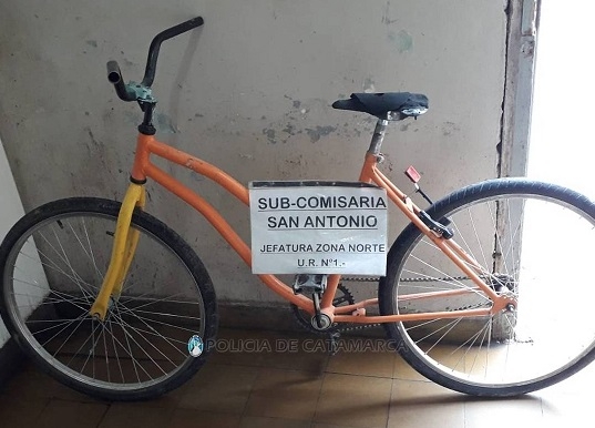 A las 11 de hoy en la Subcomisaría de San Antonio, Fray Mamerto Esquiú, se presentó un hombre de 35 años, quien hizo entrega voluntaria de una bicicleta rodado 26, de color anaranjado, la cual habría sido adquirida de buena fe por su hijo, por la suma de $200, y que podría ser producto de un hecho ilícito.