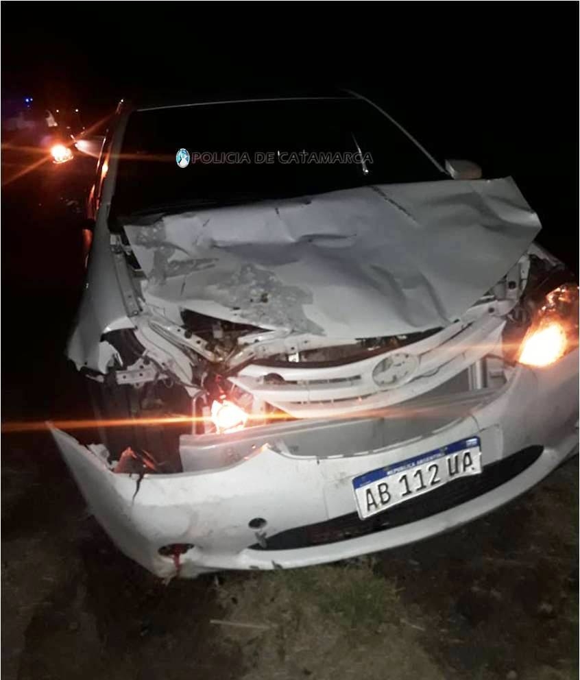 Miguel Ángel Carrizo (56) circulaba en un automóvil Toyota Etíos blanco, dominio AB112UA, perteneciente a la empresa de turismo Yokavil, en compañía de María Emilia Rossler (62), Virginia Amoroso (72) y Carlos Edgardo Lombardi (77), todos oriundos de la provincia de Buenos Aires, y por causas que se tratan de establecer, embistió a un animal vacuno.